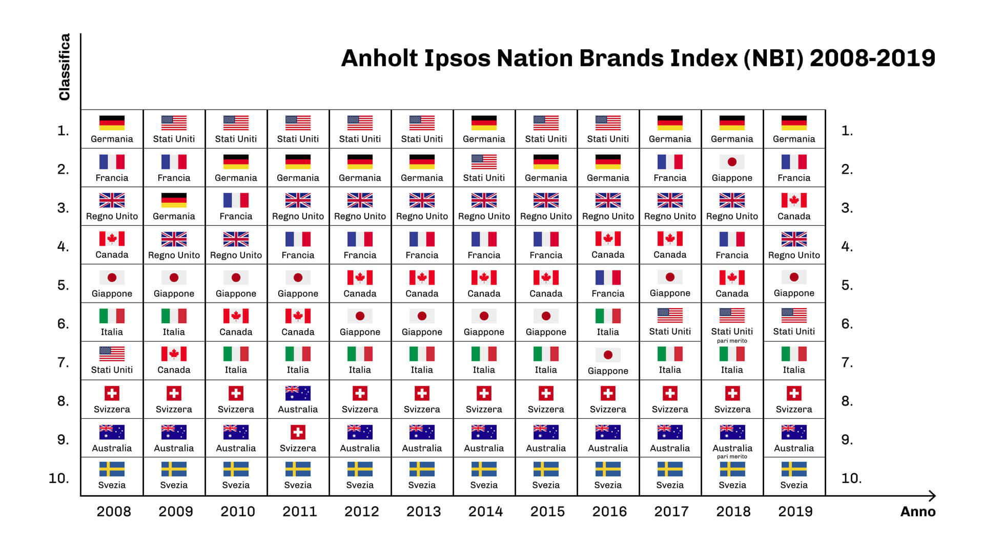 Purtroppo i dati completi dell’Anholt Ipsos Nation Brands Index non vengono rilasciati al pubblico, ma da una intervista all’ideatore dell’indice emergono una serie di considerazioni molto interessanti